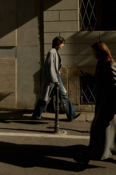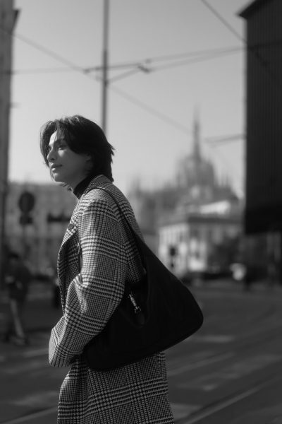 “กลัฟ – คณาวุฒิ” ถ่ายทอดเสน่ห์สุดอบอุ่นในแบบฉบับหนุ่ม Gucci ท่ามกลางไวบ์แสงแดดละมุนของมิลาน ผ่านลุค Cocco di Mamma จากคอลเล็กชั่น La Famiglia ด้วยเสื้อแขนยาวคอเต่าสีดำ จับคู่กางเกงผ้าฝ้ายเดนิมฟอกสีตกแต่งด้วยสัญลักษณ์ Horsebit พร้อมด้วยเสื้อโค้ทผ้าวูลลาย Prince of Wales สีขาว–ดำ ประดับด้วยเข็มกลัด Gucci Crest คอมพลีทลุคด้วยกระเป๋า รุ่น Jackie 1961 และรองเท้า Horsebit Loafer หนังสีดำ